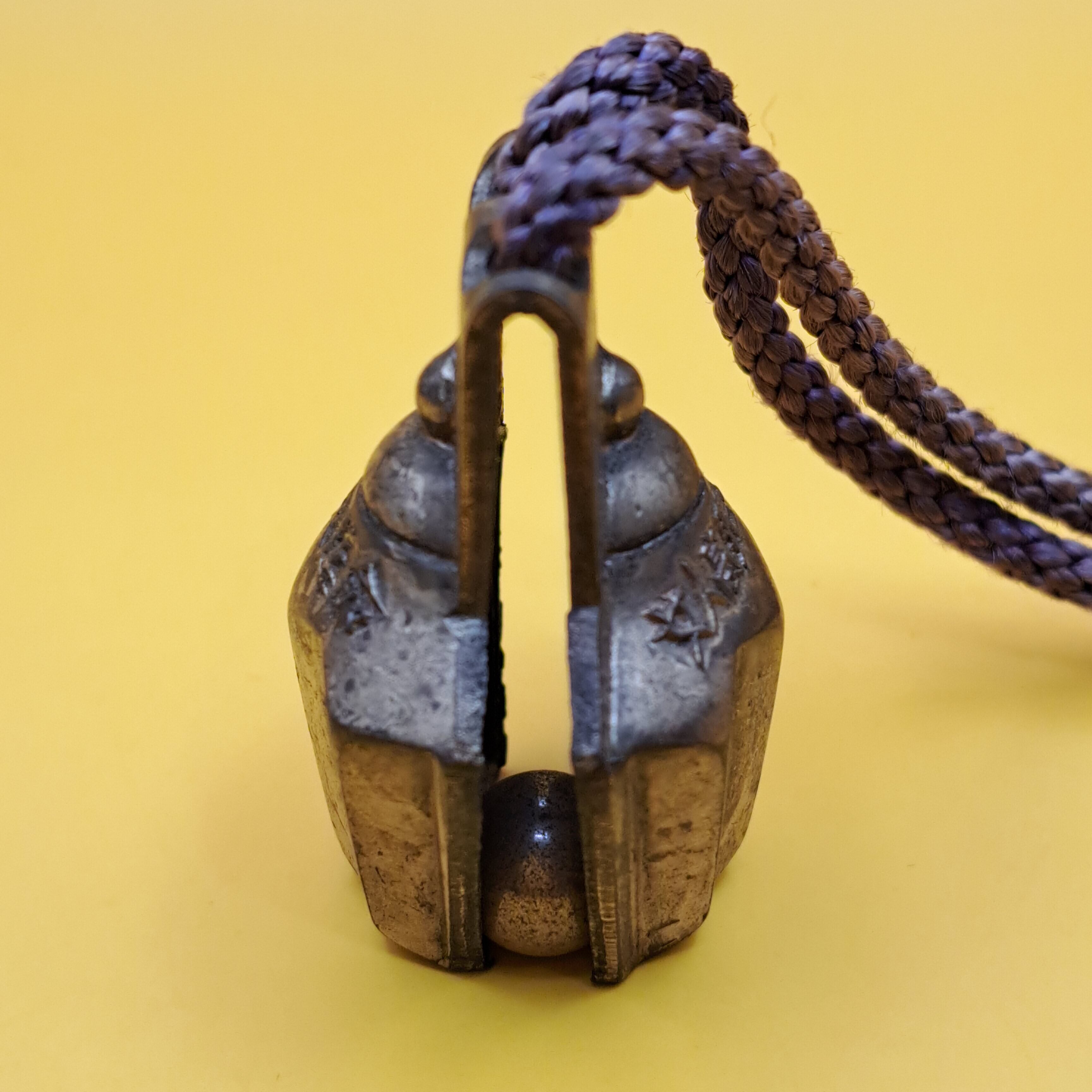 紐が全体的に色褪せ、鈴に古美たくすみや傷あり。鈴の音は鈍め。
