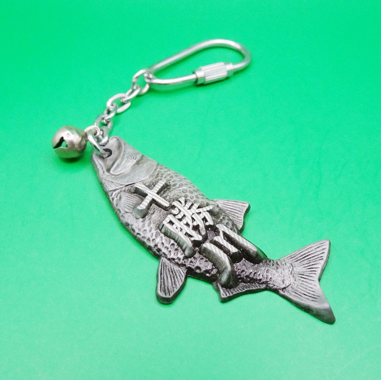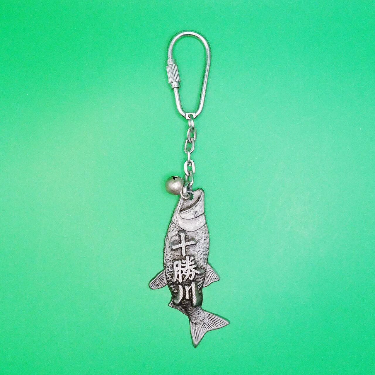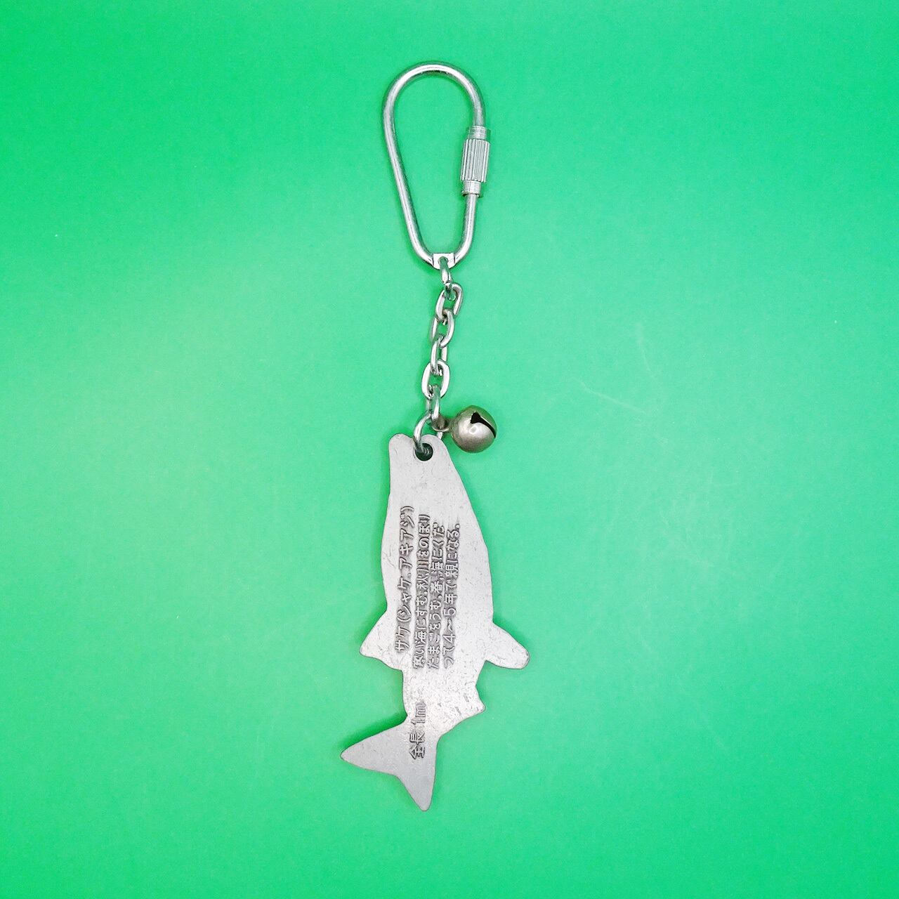 十勝川を登ってきたシャケのメタルキーホルダー。
