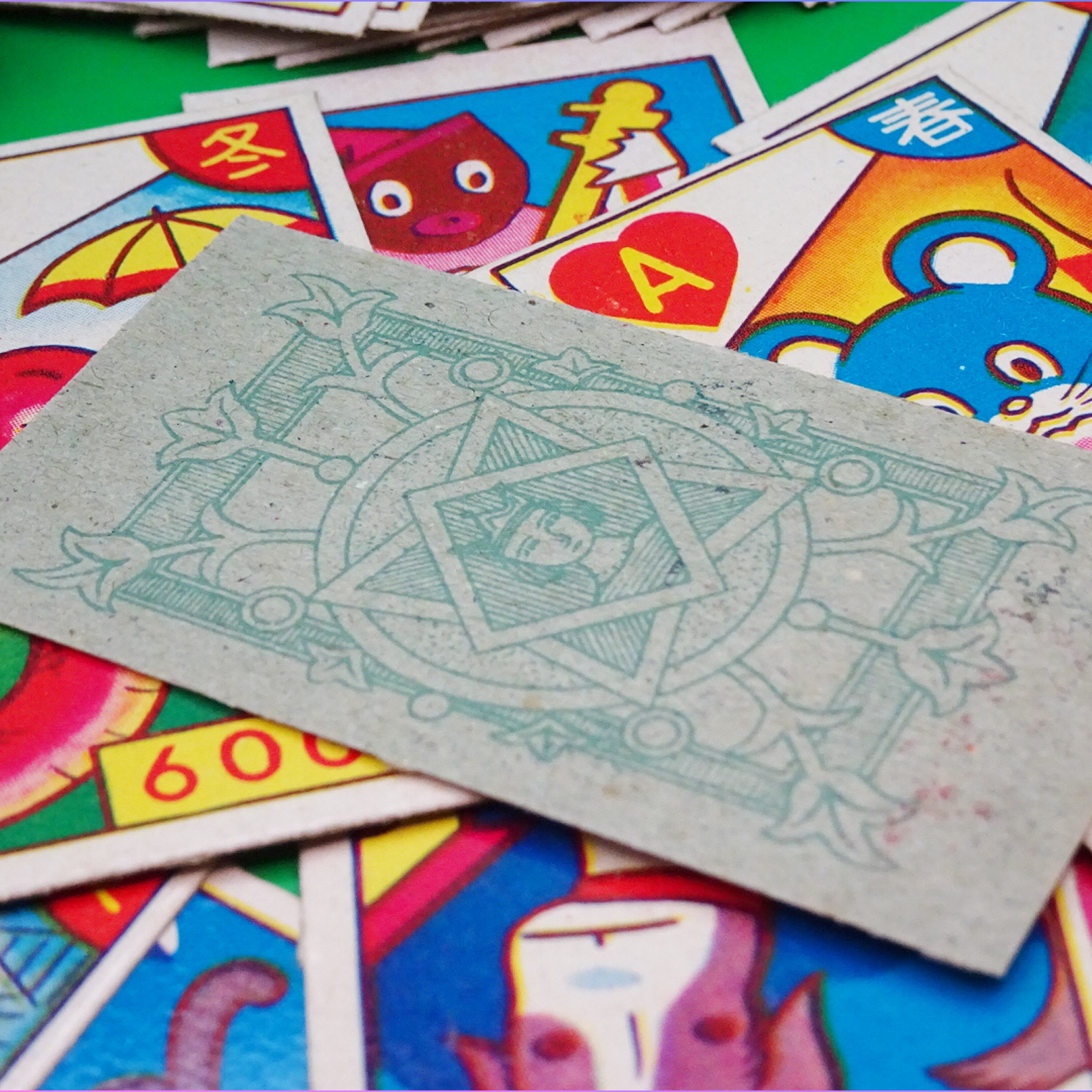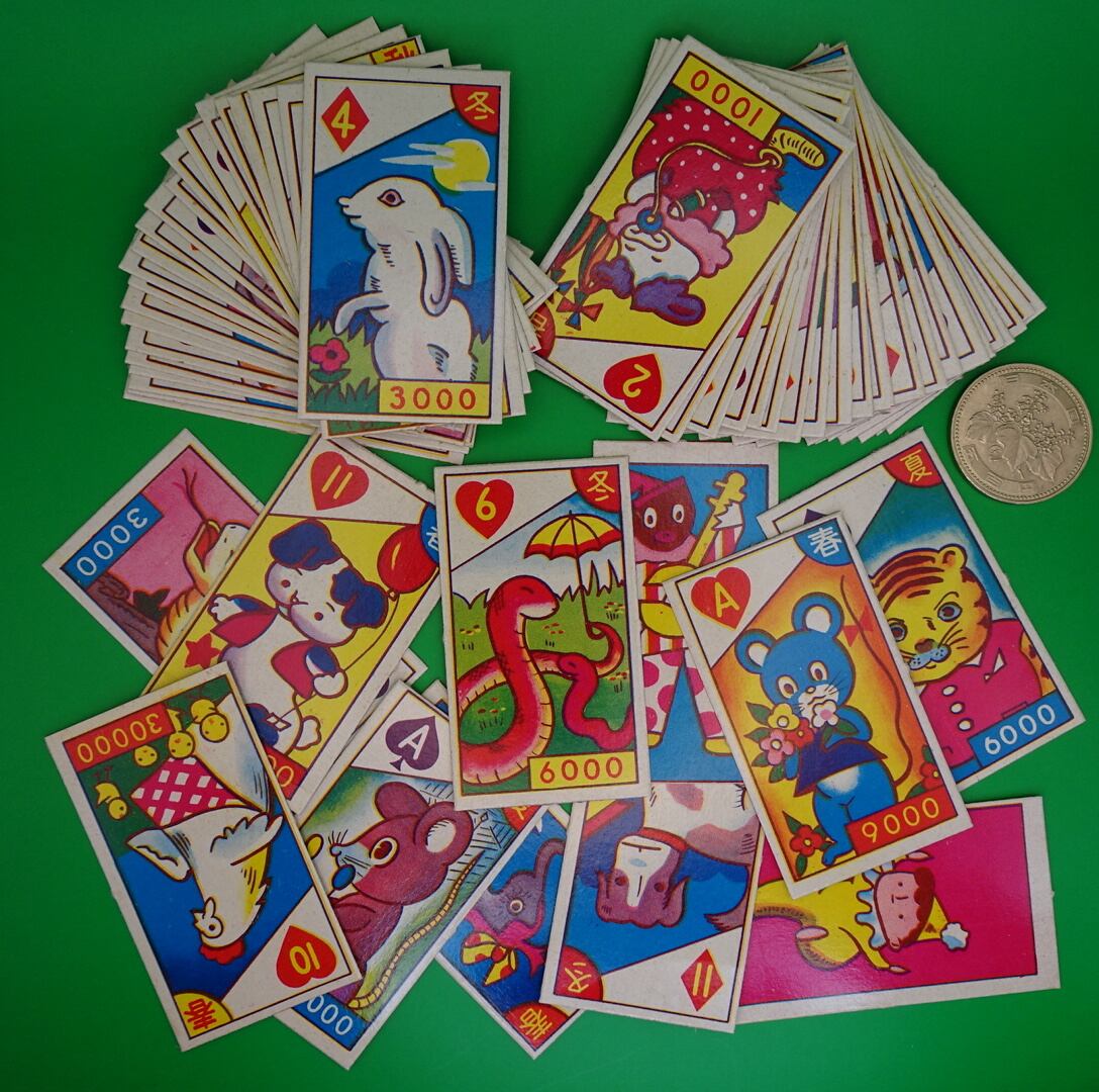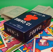 脱力感のある不可解な絵が多々ある安っぽいトランプゲームセット。余計な数字や文字が色々書いてあるので、色んな遊びができるかも。