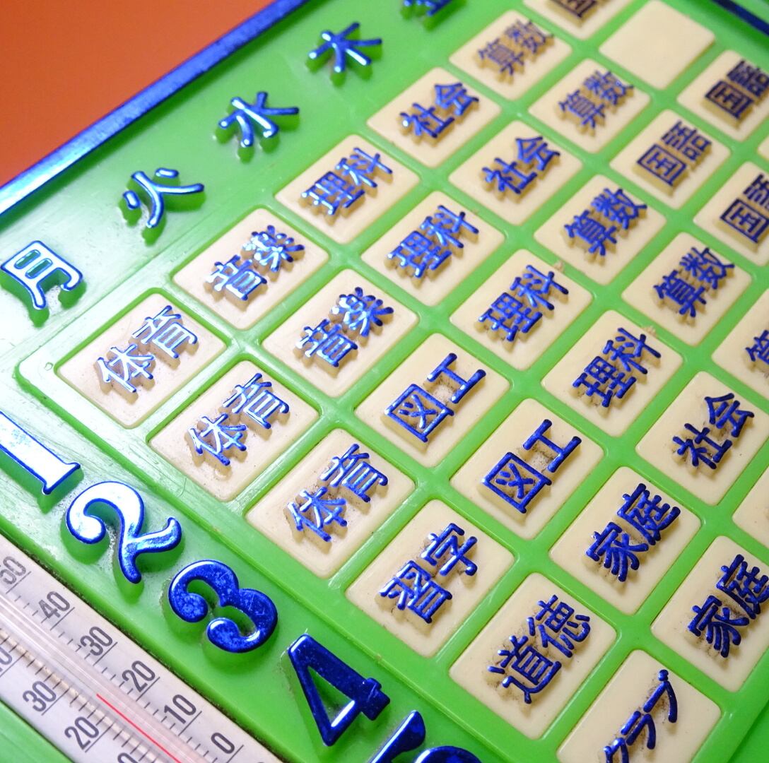温度計、ペンスタンド付きのプラスチック時間割表。