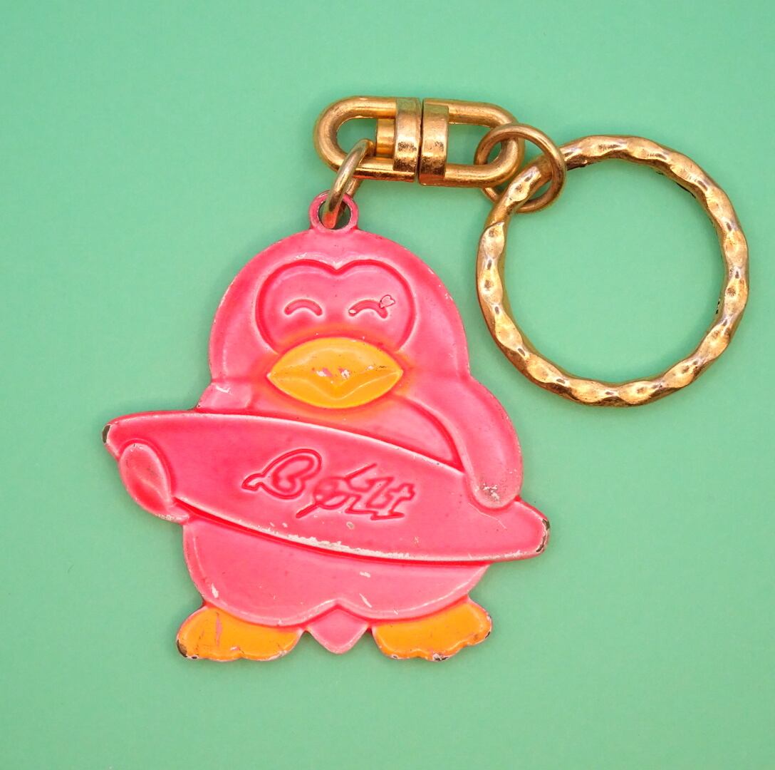 サーフィンをたしなむピンクのペンギンキーホルダー。メタル。所々に塗装剥げ、傷あり。