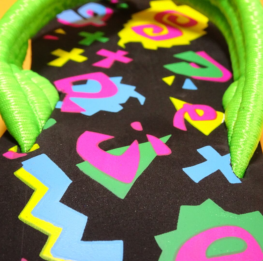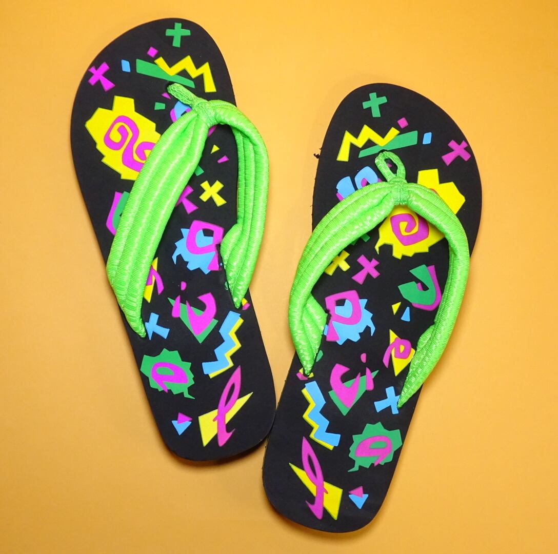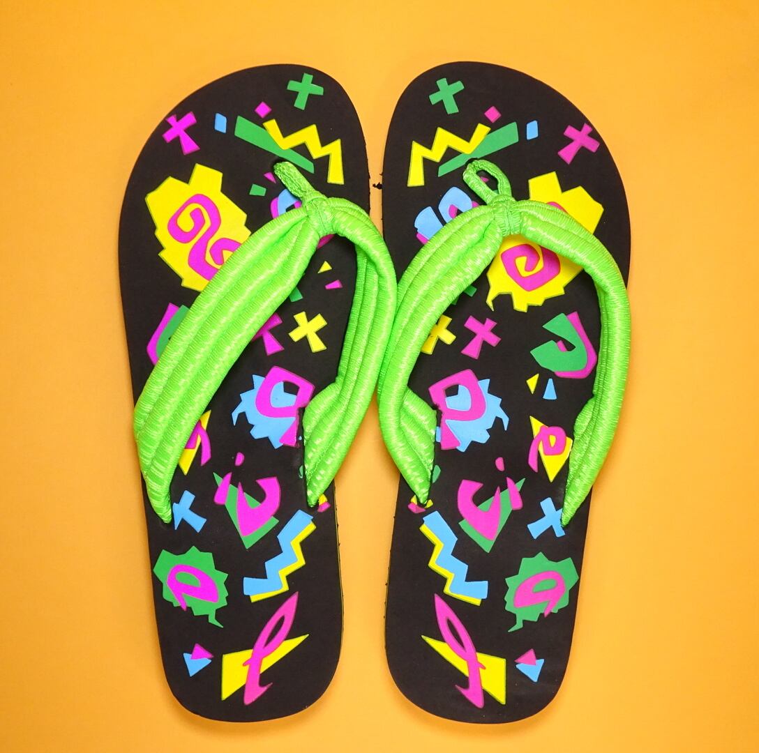 何て呼んだらいいかわからないあの模様が全面にあしらわれた当時物サンダル。一部プリントズレあり、鼻緒に付着汚れがございます。外袋に汚れあり。26㎝