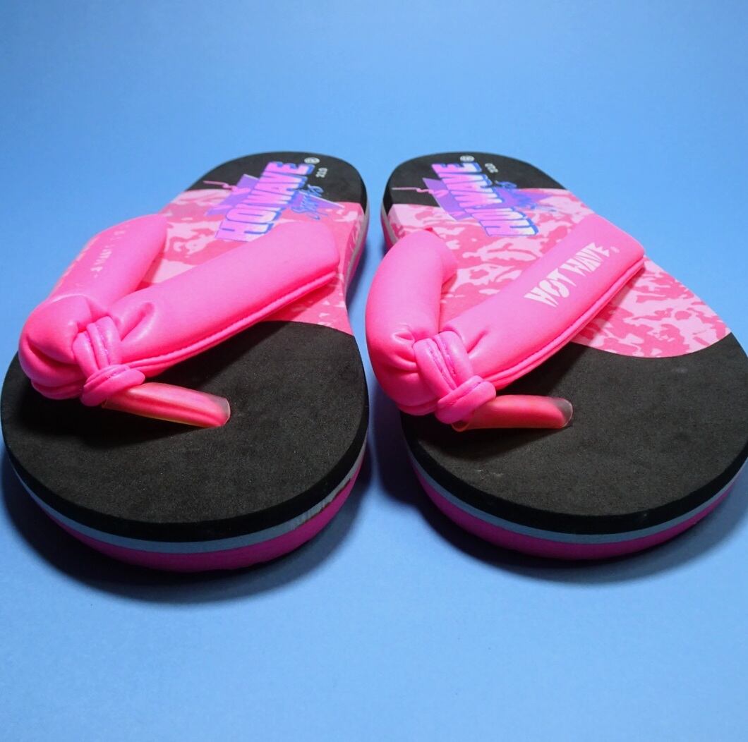 ヴェイパーウェイヴ感のある模様があしらわれた当時物サンダル。一部プリントズレあり、鼻緒に付着汚れがございます。外袋に汚れあり。23㎝